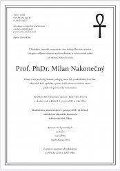 Narodil se 8. února 1932 v Horažďovicích. Milanovým otcem byl ukrajinský právník a notář Theodor Nakonečný. Milan celý život maloval a při našem posledním setkání 21. srpna mi věnoval svůj portrét, představující klauna. Obraz visí v mém domě a denně se na něj dívám. Nedávno jsem Milanovi na jeho přání daroval ukrajinskou vlajku. Milan Nakonečný do posldená doby přispíval svými texty do Divokého vína. Do rakve vložil Milanův syn malý dárek ode mne.